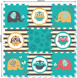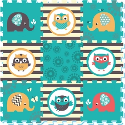 De schuimpuzzel met Uil- en Olifantmotieven in levendige kleuren trekt de aandacht van elk kind.