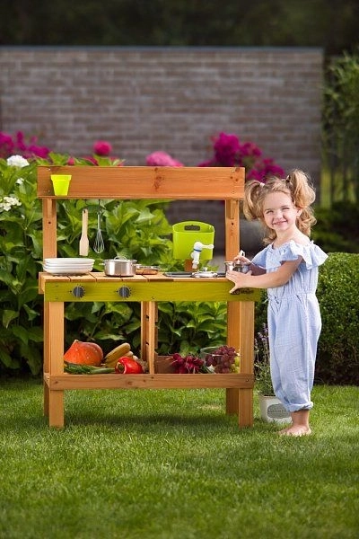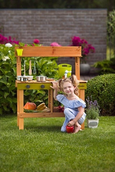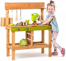 Dankzij de opvallende groene accenten past het keukentje mooi in de tuin en stimuleert het zintuiglijk spel met water, modder en bladeren. Ideaal voor kinderen vanaf 3 jaar en helpt bij de ontwikkeling van fantasie, rollenspel en sociale vaardigheden.
