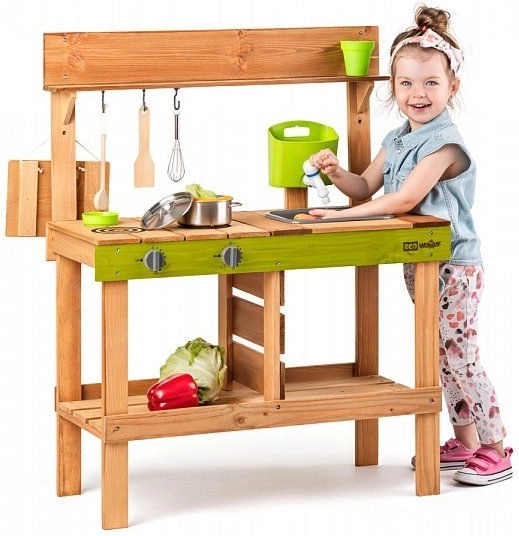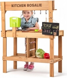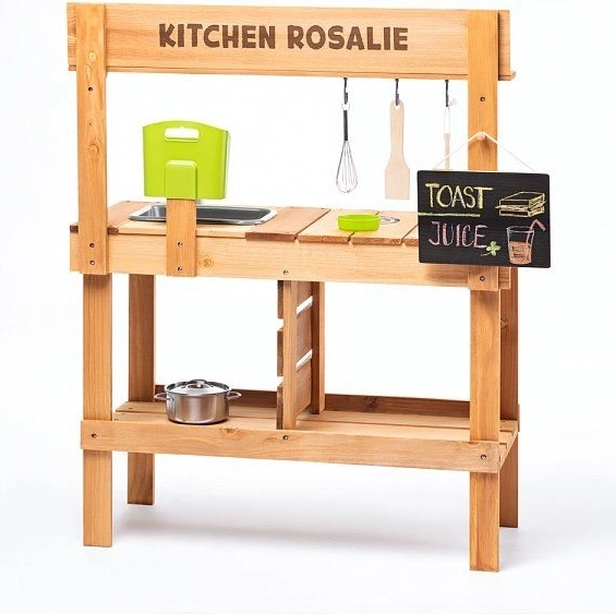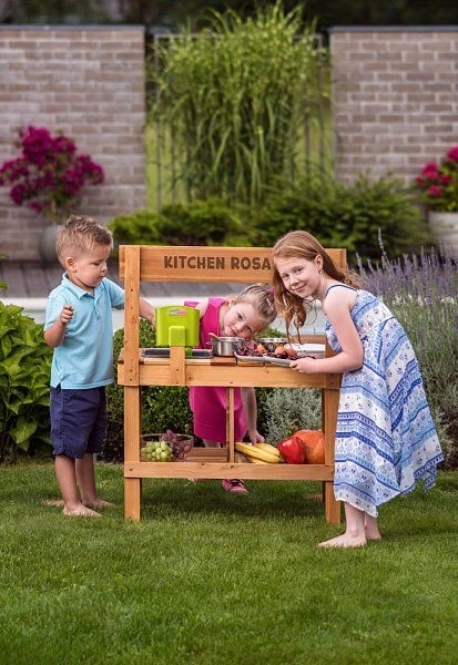 Het houten keukentje Rosalie biedt kinderen een realistische speelplek om te koken – van roeren en afwassen in de kunststof gootsteen tot serveren op het werkblad. De duurzame combinatie van hout en kunststof is geschikt voor buitengebruik, terwijl haken en plankjes al het servies en de ingrediënten overzichtelijk binnen handbereik houden.