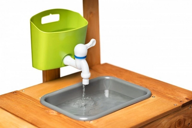 De kunststof gootsteen met witte kraan en reservoir laat kinderen veilig water inschenken en uitgieten, en leert ze de basis van hygiëne en netjes spelen.