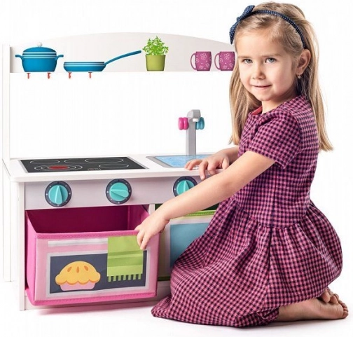Deze multifunctionele houten 2-in-1 keuken en bank biedt kinderen uren speelplezier en praktisch gebruik in één. De keuken is uitgerust met een kookplaat met draaiknoppen, een gootsteen met kraan en opbergvakken die doen denken aan een oven en magnetron. Dankzij de stabiele constructie is hij geschikt voor dagelijks spelen én zitten.