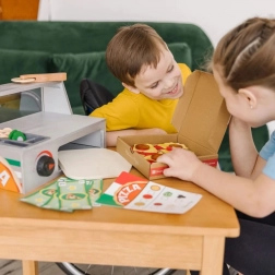 Dankzij het realistische ontwerp, inclusief oven en draaiknoppen, biedt het een echte kookervaring. Het bevat ook een houten pizza met toppings en speelgeld, waarmee kinderen het proces van pizza bestellen en betalen kunnen ervaren.