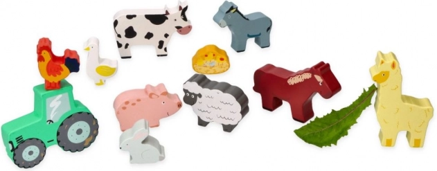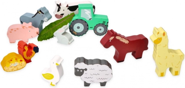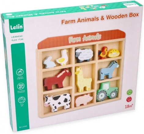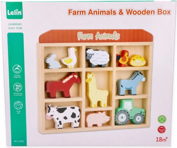 Deze set bevat verschillende dieren zoals een koe, een paardje, een schaapje, een varkentje, een kip en meer, inclusief een kleine tractor voor nog meer plezier. Alles is opgeborgen in een praktische houten lijst, die ook dient als opslagruimte.