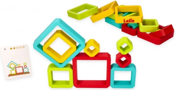 De set bevat educatieve kaarten die verschillende combinaties voor het stapelen voorstellen. Kinderen kunnen proberen de ontwerpen op de kaarten na te bouwen of hun eigen originele structuren maken.