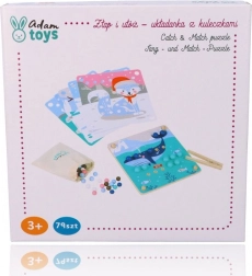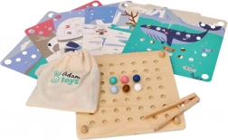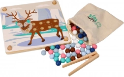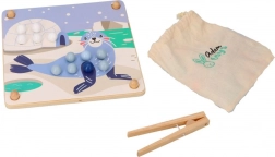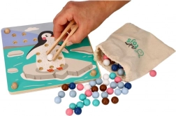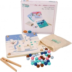 Dit leuke educatieve spel combineert natuurlijke kinderlijk nieuwsgierigheid met vaardigheidstraining: met behulp van het houten pincet verplaatsen kinderen de kralen en plaatsen ze die in openingen op basis van kleuren en sjablonen met motieven van Arctische dieren (pinguïn, zeehond, rendier, ijsbeer). Het spel bevordert concentratie, een precieze greep en vaste hand – ideaal voor kleuters.