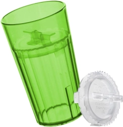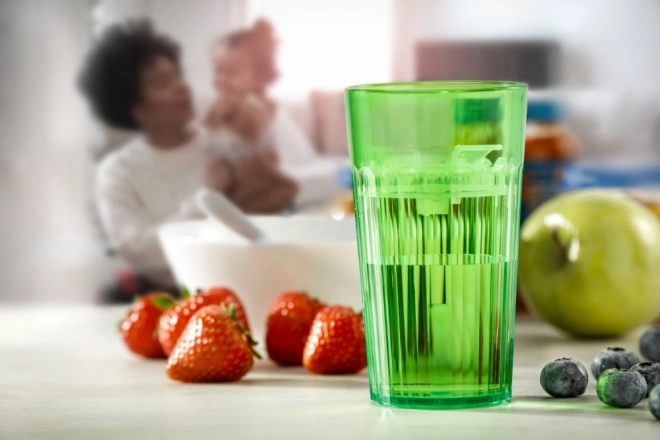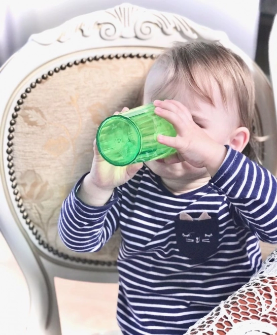 De speciale inzet in de beker vertraagt de vloeistofstroom, zodat het kind veilig leert drinken uit een open beker zonder tuitjes en rietjes.