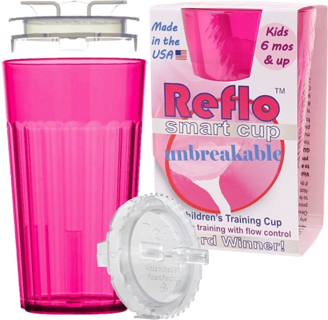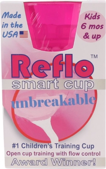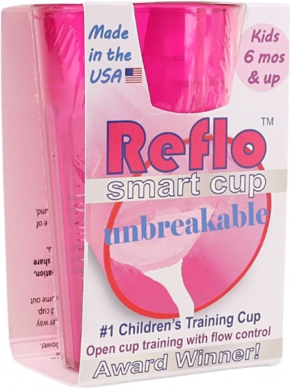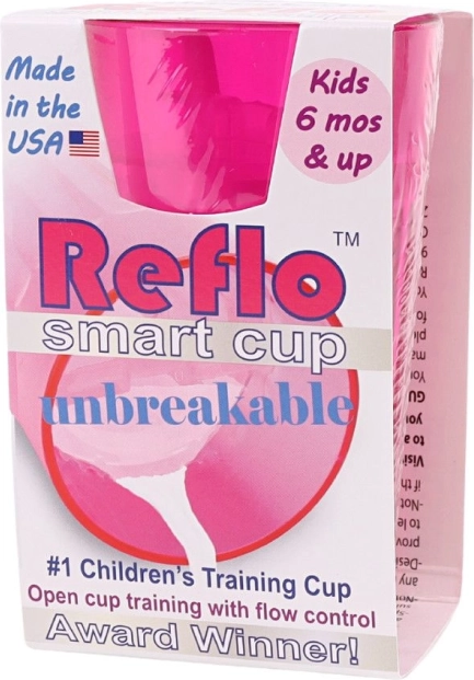 De roze Reflo-trainingsbeker helpt kinderen vanaf 6 maanden veilig te leren drinken uit een open beker. Dankzij de doorstroomregeling wordt morsen verminderd, het onbreekbare ontwerp is ideaal voor thuis en onderweg en het compacte volume van 170 ml ligt goed in kinderhandjes. Gemaakt in de VS, voldoet aan EN 14350.