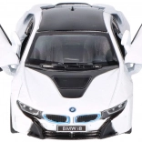 De gedetailleerde uitvoering van het metalen BMW i8-model omvat nauwkeurige designelementen, zoals de karakteristieke BMW-grille en de vorm van de koplampen.