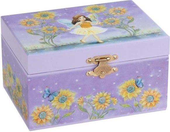 Deze sieradendoos in de stijl van een klassieke speeldoos zal elk kind verheugen dat zijn of haar schatten elegant wil bewaren. Bij het openen van het deksel klinkt de zachte melodie uit de opera Het Zwanenmeer en een kleine ronddraaiende ballerina danst voor de ingebouwde spiegel. Het zonnebloemmotief geeft de sieradendoos een speelse en toch verfijnde uitstraling.