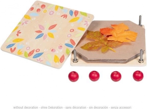De pers bestaat uit twee houten delen, vier schroeven op elke hoek en kartonnen tussenlagen.