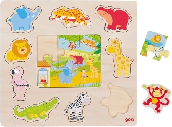 Houten inlegpuzzel voor kleine kinderen met een thema van dieren uit de dierentuin, met 9 inlegstukjes en een puzzel met 6 stukjes. Ideaal voor de ontwikkeling van kindercoördinatie en denkvermogen.