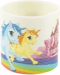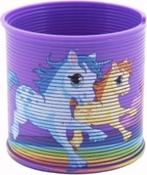 Leuke kunststof spiraalveer met eenhoornmotief maakt zowel kinderen als volwassenen blij. Dankzij de veerkrachtige constructie kan hij “lopen” op trappen, trucjes doen en is het een geweldige stressverlichter. Het compacte formaat met een diameter van 6,5 cm en de levendige kleuren maken het een ideaal cadeau voor kinderen vanaf 3 jaar.