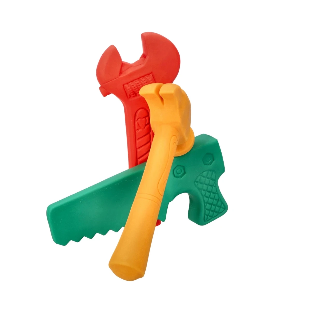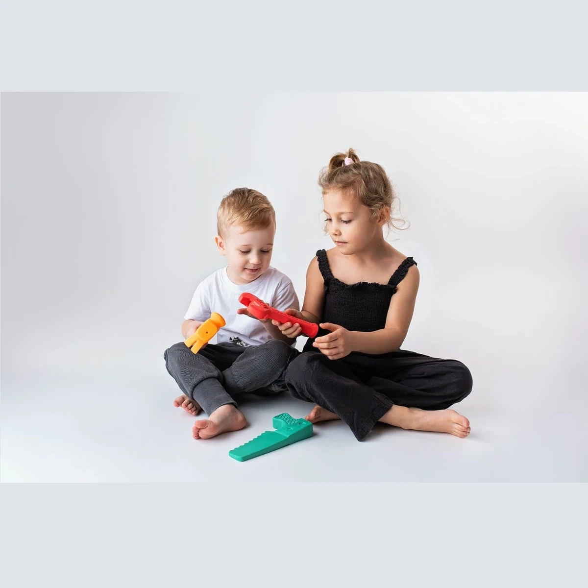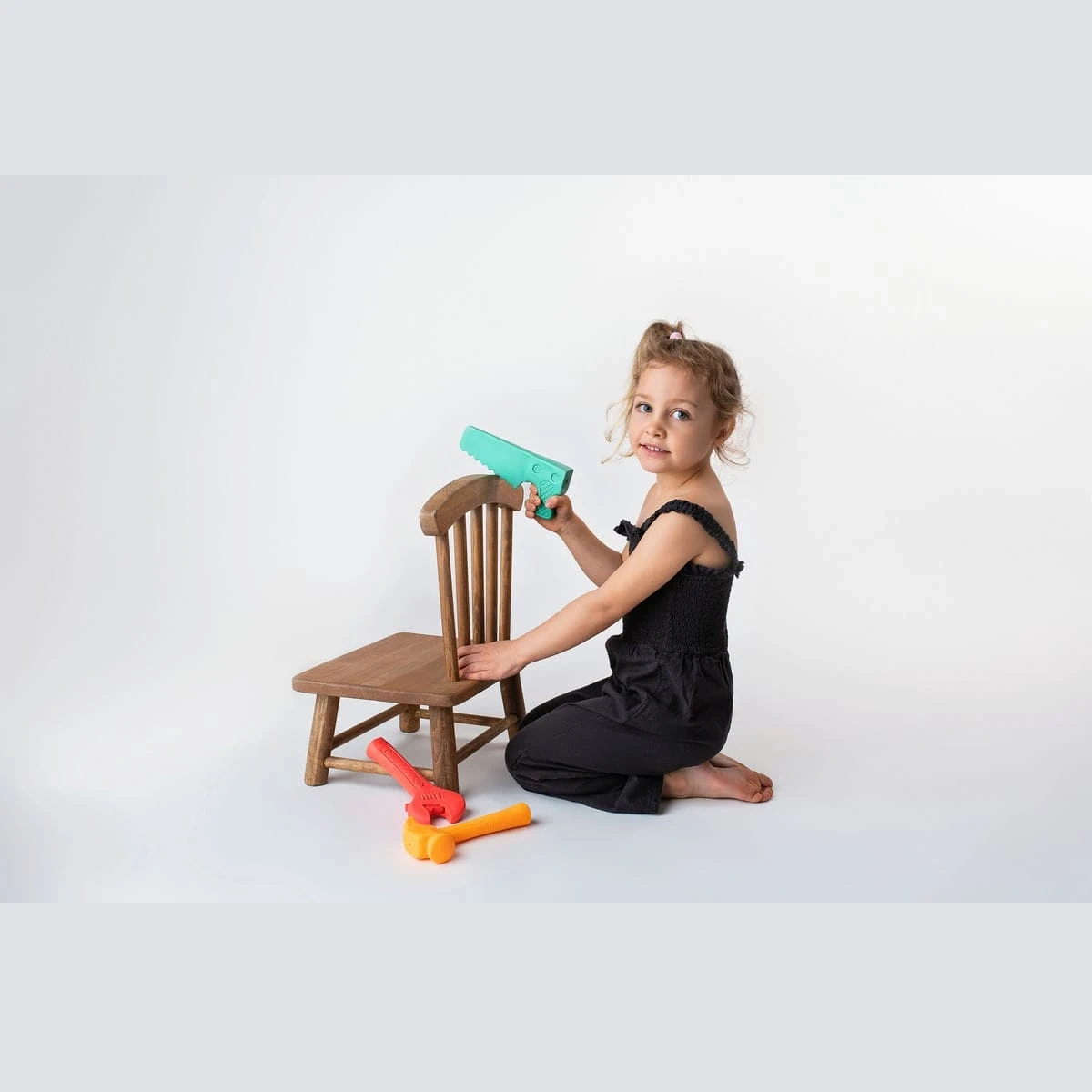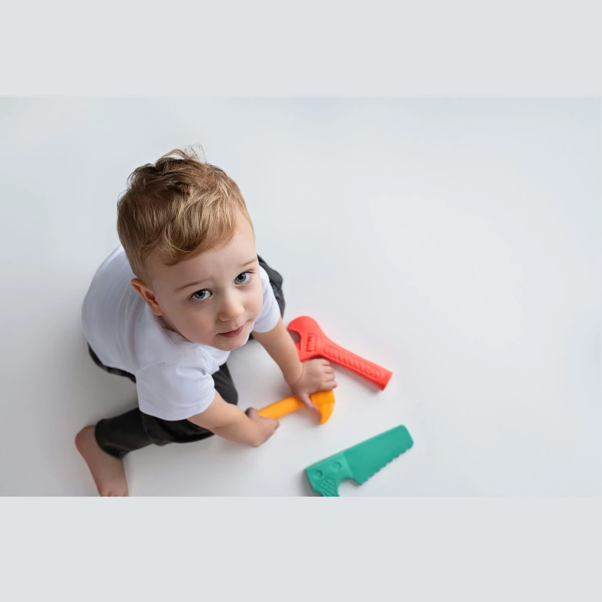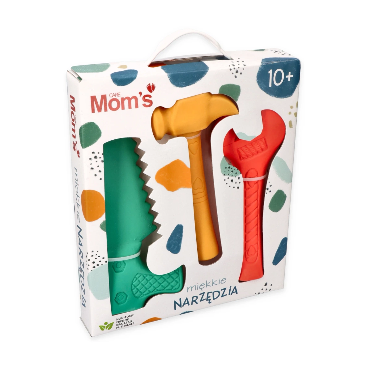 Ontdek een speelse set van drie zachte tools – een zaag, hamer en sleutel – ontworpen voor veilig spel en vaardigheidsontwikkeling. Dankzij het zachte materiaal, de texturen en de pasteltinten stimuleert het de ontwikkeling van de fijne motoriek, zintuiglijke waarneming en oog-handcoördinatie. De tools zijn licht, flexibel en veilig, zelfs voor de allerkleinsten.