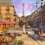 De scène omvat een levendige straat­sfeer met bloemenkraampjes en klassieke architectuur, wat de complexiteit en levendigheid benadrukt.