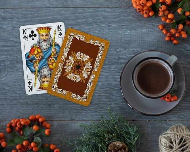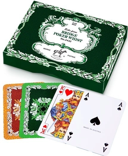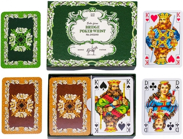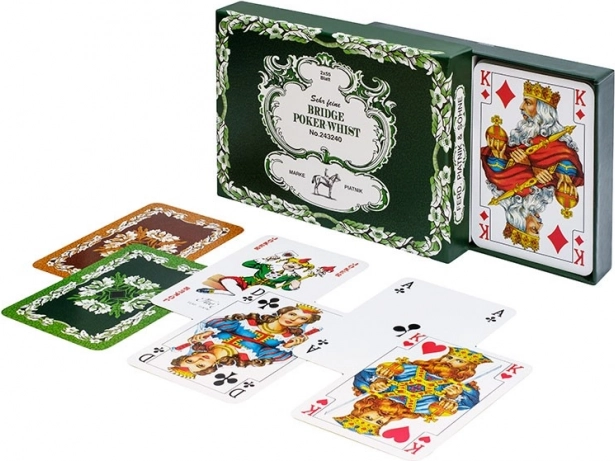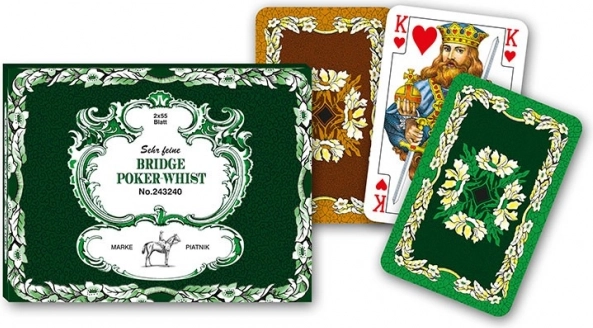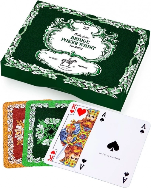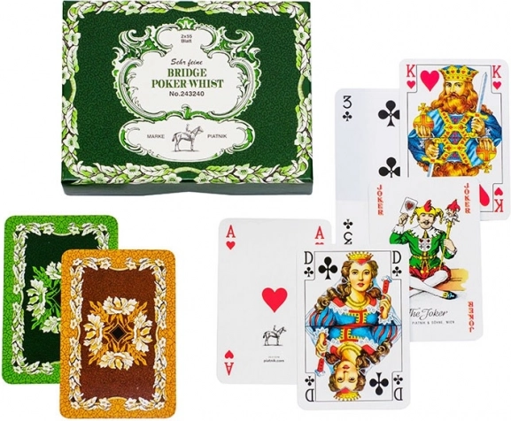 Klassieke Piatnik speelkaarten met een eikenbladerenmotief in een praktisch dubbelpak, ideaal voor liefhebbers van bridge, poker en rummy. Elke set bevat 55 geplastificeerde kaarten met een formaat van 58 × 89 mm en een gramgewicht van 310 g/m², bekend om hun duurzaamheid, prettige grip en elegant design gebaseerd op een vooroorlogse traditie.