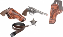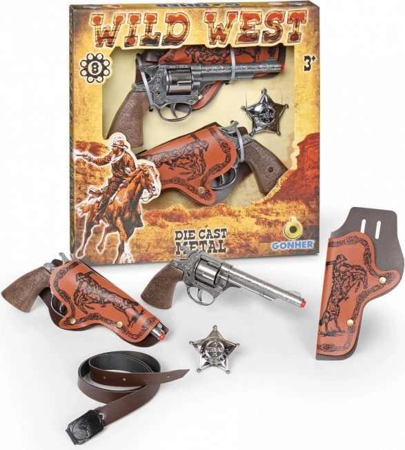 Ontdek authentiek Wild West-plezier met de GONHER-set – twee metalen cowboyrevolvers met een 8-schots trommel, aangevuld met een stijlvolle holster en een sheriffbadge. Ideaal voor themaspellen, kostuums en kleine avonturiers.