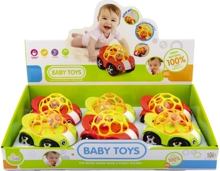 De plastic auto is zodanig ontworpen dat het opvalt bij kinderen door zijn vrolijke kleuren en rammelende geluiden die door het balletje binnenin gemaakt worden. Dankzij het zachte en open dak is het ook voor de allerkleinsten gemakkelijk vast te houden.