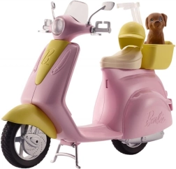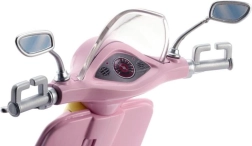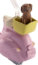 Ontdek een wereld vol verhalen met de iconische BARBIE-scooter, die uitnodigt tot nieuwe uitstapjes en grote avonturen. Dankzij de speciale bevestiging blijft de pop stabiel tijdens het rijden en reist het puppy comfortabel en veilig mee in het gele achtermandje.