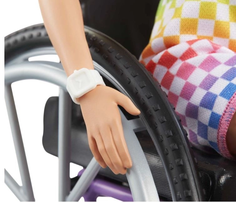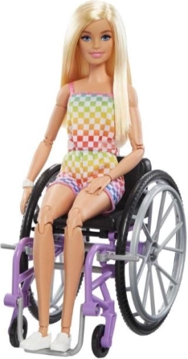 Ontdek de wereld van diversiteit met de collectie Barbie Fashionistas. Deze stijlvolle pop in een paarse rolstoel heeft 22 gewrichten voor realistische poses, lang blond haar en draagt een regenboogkleurige geruite overall met witte sneakers. Er zit ook een roze oprijplaat bij voor nog creatiever spel en verhalen over inclusie.