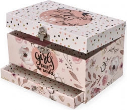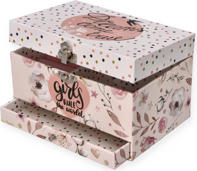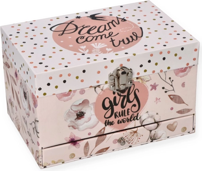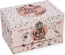 In het onderste gedeelte zit een uitschuiflade voor extra opbergruimte, een veilige metalen sluiting en een duurzaam, lichtgewicht ontwerp dat perfect is voor de kinderkamer. Opschriften in de stijl van “Girls rule the world” en “Dreams come true” zorgen voor een speelse look en prikkelen de fantasie.