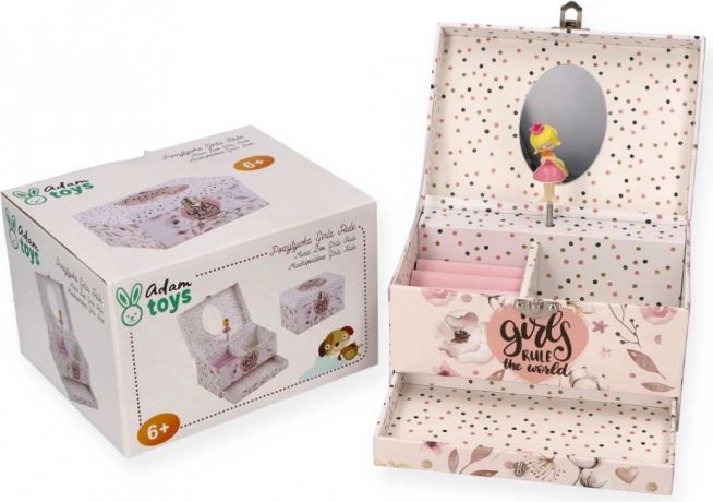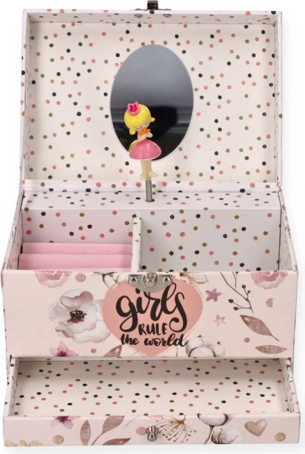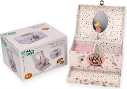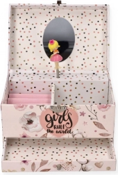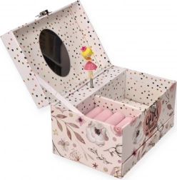 Een schattige sieradendoos met muziekwerk en draaiende ballerina die elke kleine dame blij maakt. Heeft overzichtelijke vakjes, kussentjes voor ringen, een uitschuiflade en een ovaal spiegeltje. Ideaal voor het opbergen van sieraden en kleine spulletjes en als prachtige kamerdecoratie.