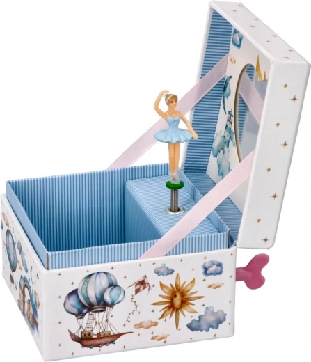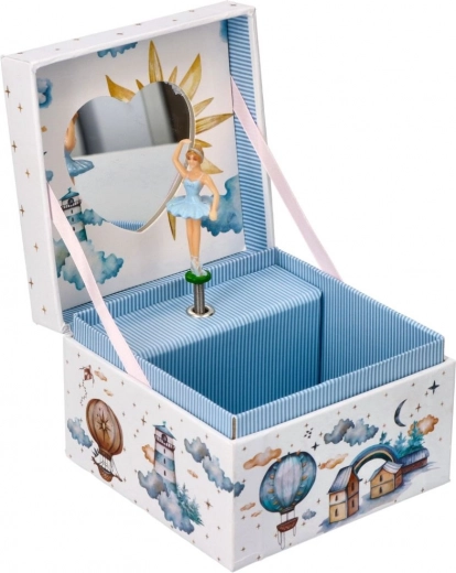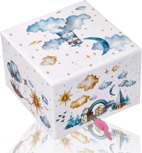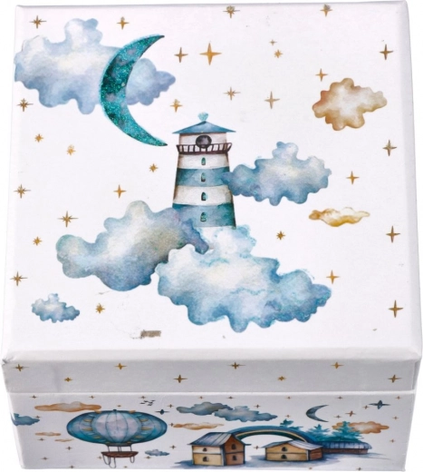 Dit muziekdoosje is versierd met betoverende illustraties van vuurtorens, ballonnetjes en sterren, wat een vleugje fantasie toevoegt aan elke kamer.