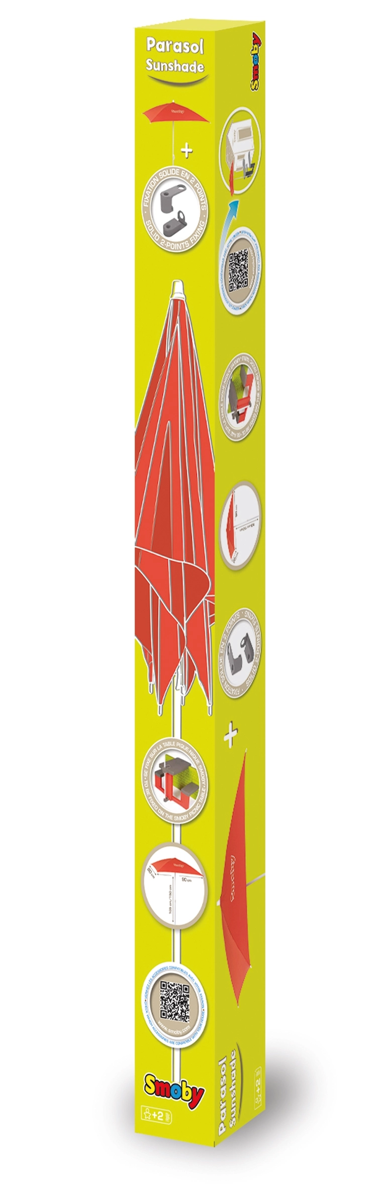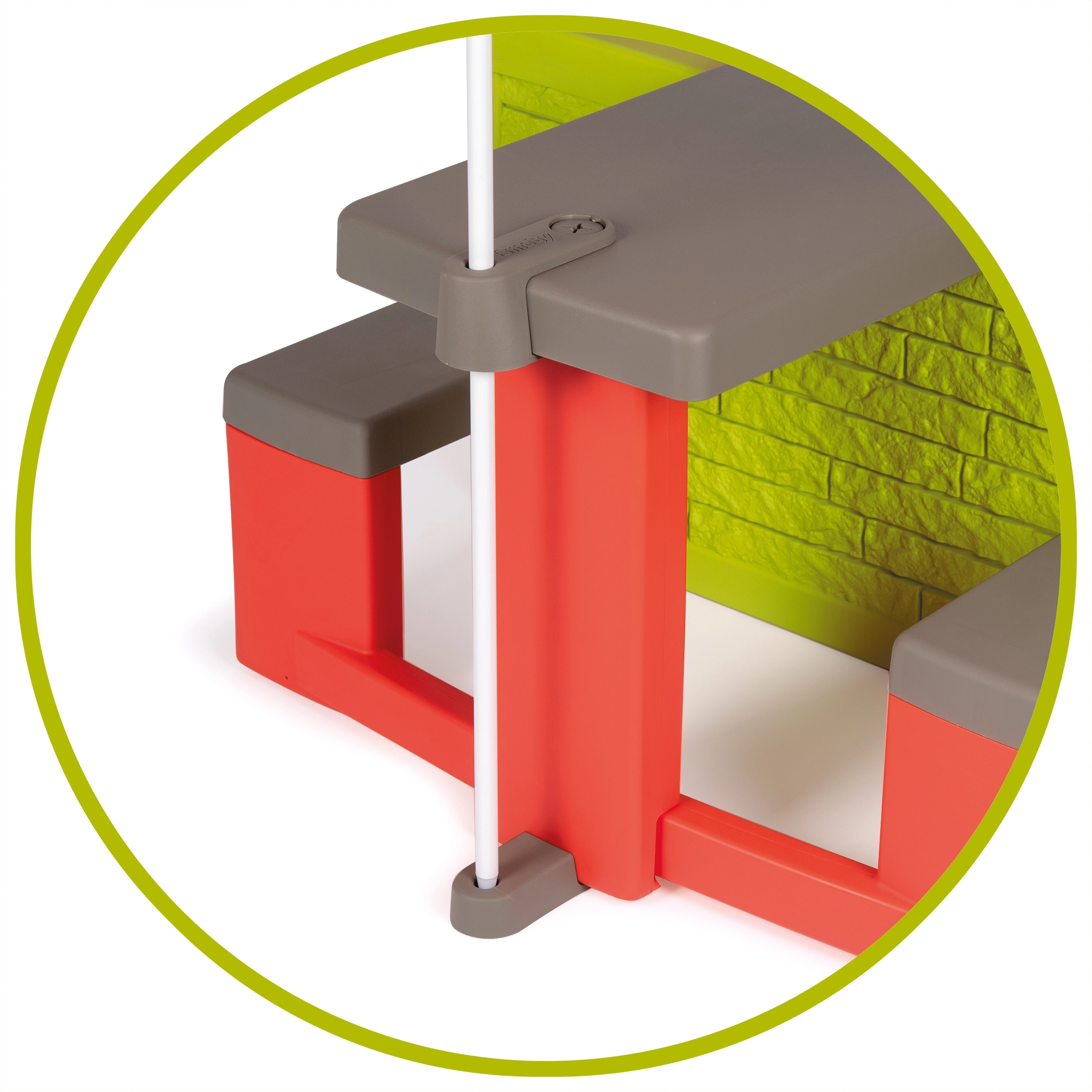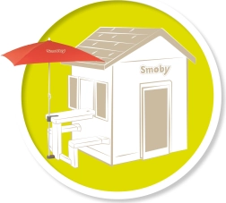 Parasol voor bescherming tegen zon en regen, bevestigd aan de SMOBY cottage tuintafel.