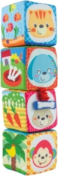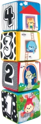 Ontdek een set van 4 kleurrijke, zachte textielblokken voor baby’s en peuters die het zintuiglijk waarnemen, de fijne motoriek en het leren van cijfers en vormen stimuleren. Elk blok heeft verschillende texturen, een veilig spiegeltje en illustraties van dieren, cijfers en vormen. De blokken kunnen worden gestapeld tot een stabiele piramide en samengevoegd tot afbeeldingsreeksen voor spelenderwijs leren.