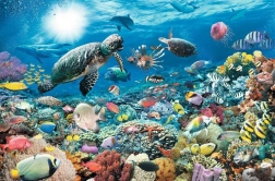 Deze puzzel toont een levendige onderwaterwereld vol kleurrijke vissen, schildpadden en koralen, wat het tot een visueel genot maakt.