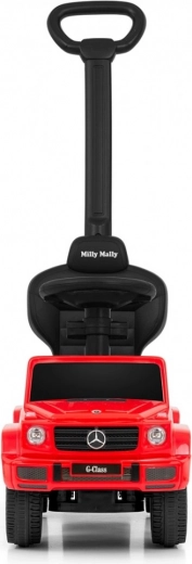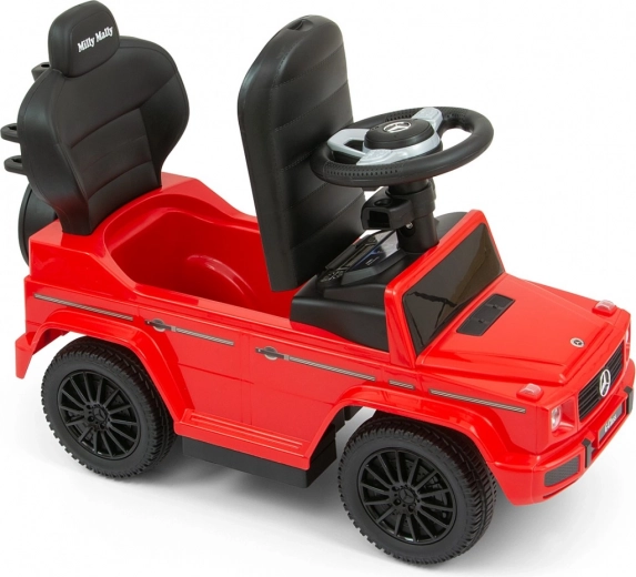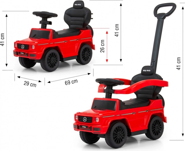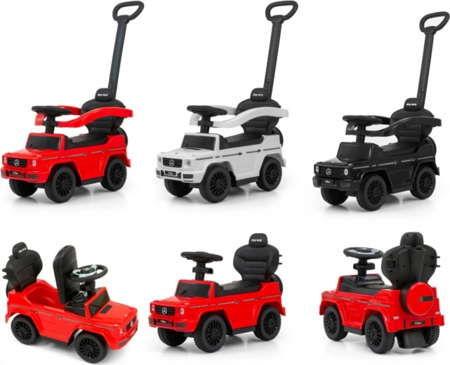 De MERCEDES G350d loopauto met officiële Mercedes-licentie is vervaardigd met grote aandacht voor de kleinste details en de kwaliteit van de gebruikte materialen. Dankzij het multifunctionele karakter verveelt het speelgoed uw kind niet snel en worden handvaardigheid en motorische vaardigheden spelenderwijs ontwikkeld. Een extra voordeel is het interactieve stuur, dat het spel nog leuker maakt. Het product heeft zwenkwielen die met het stuur of de duwstang worden bestuurd, wat zorgt voor comfortabel rijden tijdens wandelingen. Het is zeer eenvoudig te monteren en te demonteren, stabiel en veilig. De afzonderlijke elementen (beugels en duwstang) kunnen worden verwijderd, zodat de loopauto “meegroeit” met uw kind.