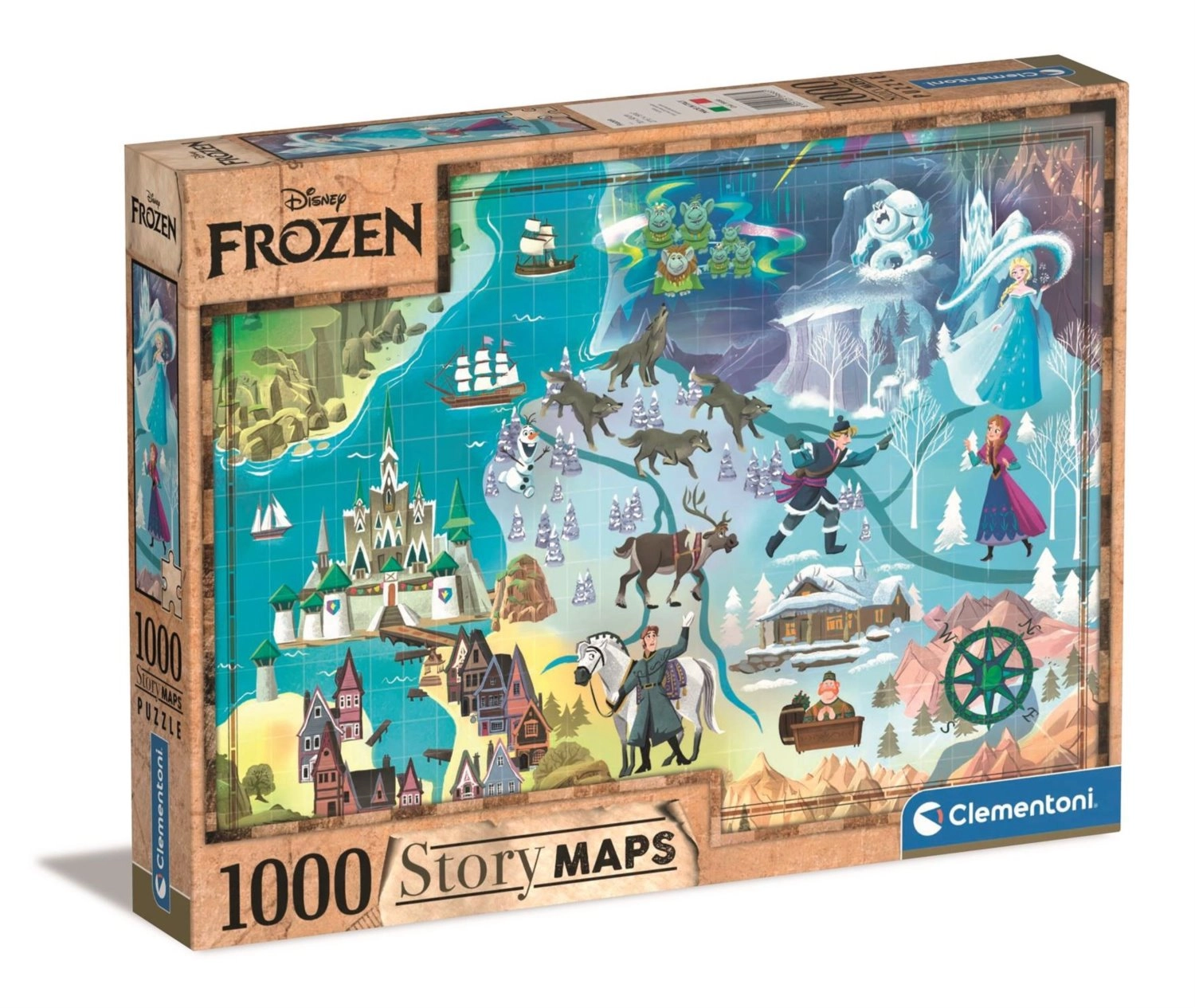 Puzzle Story Maps van Clementoni is een unieke manier om het volledige sprookjesverhaal van Frozen vast te leggen en te beleven in één prachtig beeld. Deze puzzel van 1000 stukjes biedt: