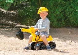 De graafmachine is ontworpen voor veilig spel, zowel buiten als binnen. Een praktische vergrendeling fixeert het draaien tijdens het dragen of bij jongere kinderen; het grote zitvlak biedt comfort en zekerheid. De ideale partner voor zandbak, tuin en speelplaatsen.