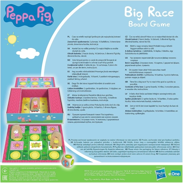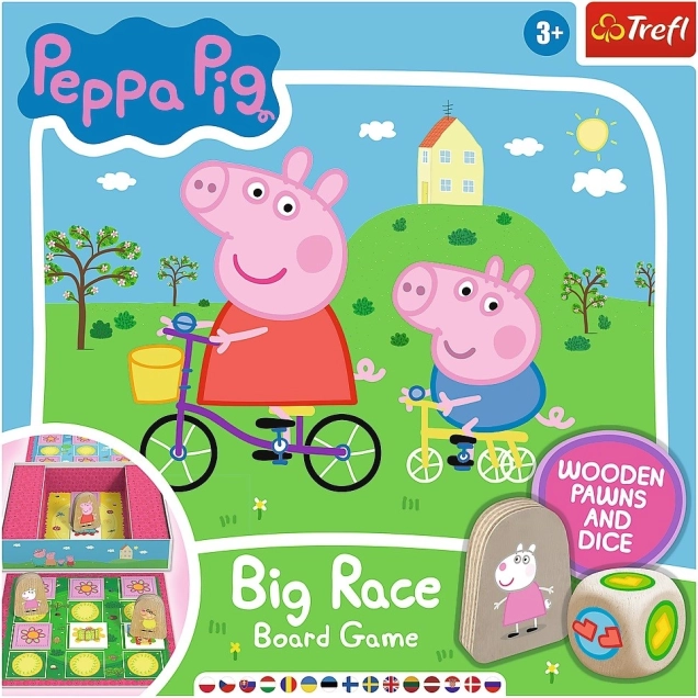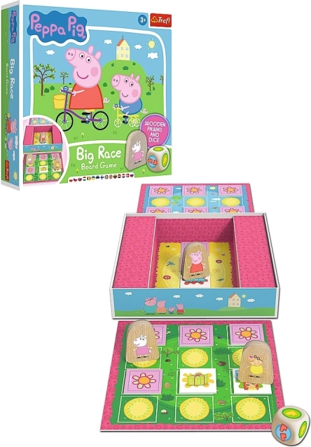 Big Race (Grote race) is een vrolijk en eenvoudig bordspel met de Peppa Pig-licentie, waarin kinderen hun eerste overwinningen en nederlagen beleven. Gooi met de grote houten dobbelsteen, verplaats je houten pionnen over het kleurrijke bord en onthul kaartjes met speciale acties – extra worp, pion wisselen, een stap vooruit of terug. Het doel is duidelijk: als eerste het speelbord verlaten en de grote race winnen!