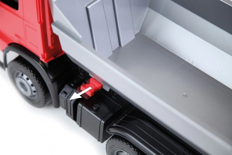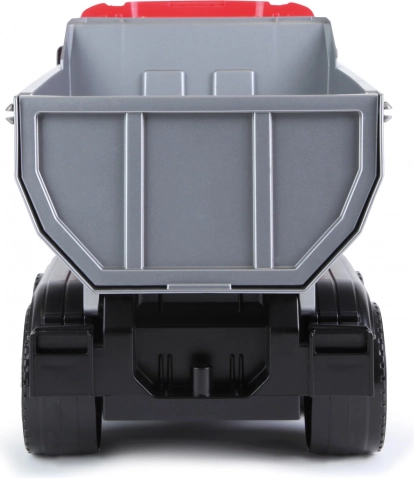 Het model in een moderne rood-zwarte kleurcombinatie is uitgerust met verzinkte stalen assen met een diameter van 6 mm voor maximale duurzaamheid. De praktische laadbak is kantelbaar en kan in gesloten positie worden vergrendeld, zodat zand, steentjes en andere lading gemakkelijk kunnen worden vervoerd.