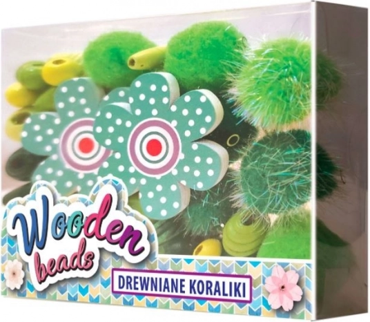 Creatieve set voor kinderen: groene houten kralen, pompons, bloemhangers en 1 m gewaxte koord. Ideaal voor armbanden en kettingen. Leeftijd 4+.
