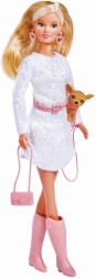 Ontdek de wereld van mode en fantasie met pop Steffi, die de trends zet. Haar witte glinsterende jurk wordt aangevuld met een roze riem met hartvormige gesp, opvallende hartoorbellen, een stijlvol handtasje en roze laarsjes. Dankzij de zorgvuldig op elkaar afgestemde details oogt de outfit modern en speels tegelijk.