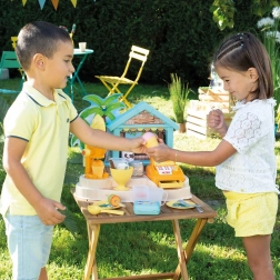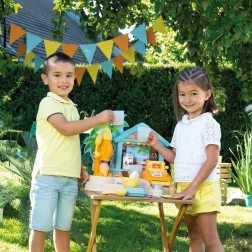 De SMOBY strandbar is een creatieve kinderkraam voor rollenspel als verkoper en klant. Kinderen proberen het maken van ijscoupes, smoothies en fruitspiesen, het versieren met sauzen en strooisels en het afrekenen op een functionerende kassa. Realistische details stimuleren fantasie, sociale vaardigheden en de fijne motoriek.