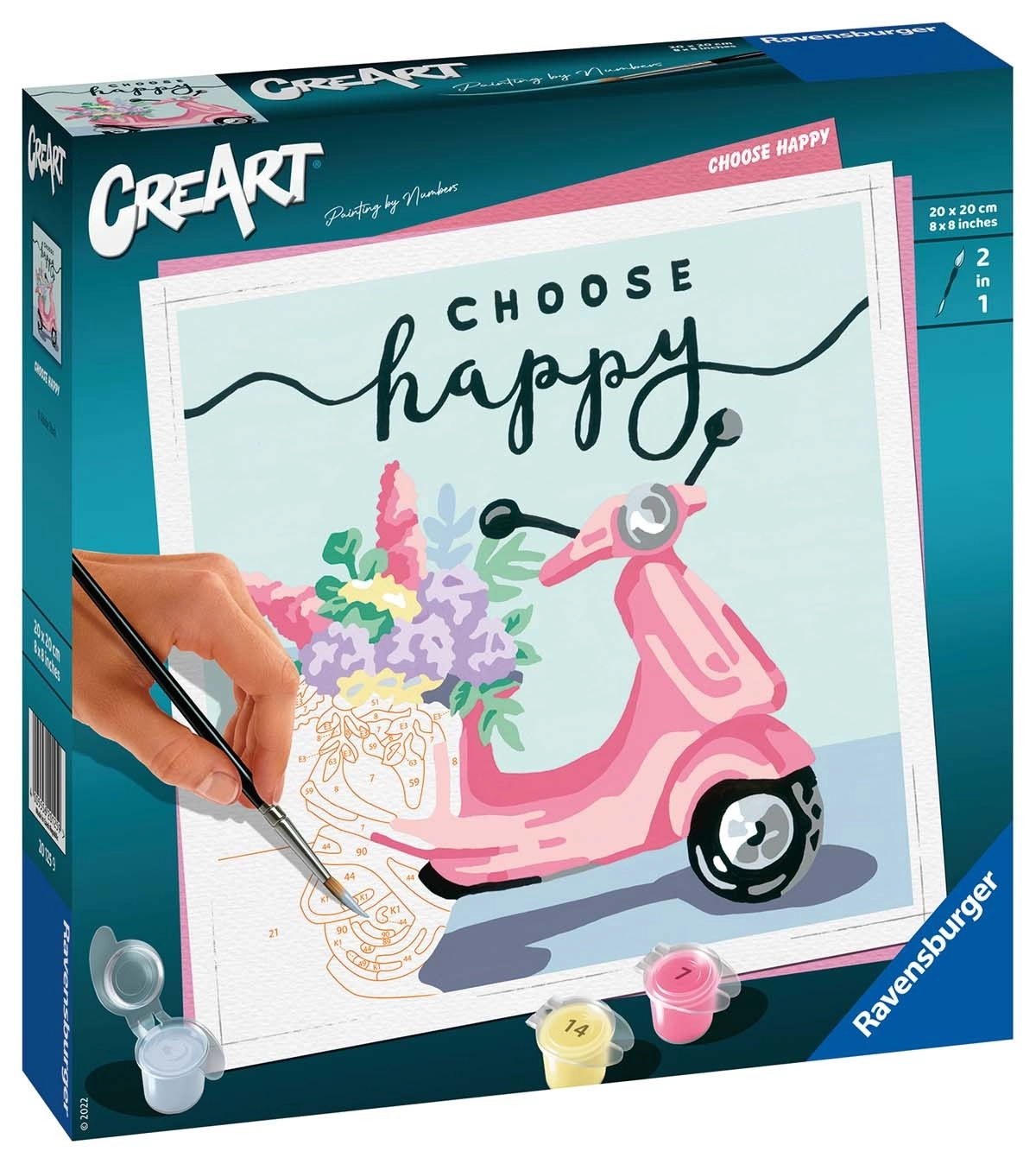 De CreArt “Choose Happy” creatieve set biedt kinderen vanaf 12 jaar de mogelijkheid om verschillende beeldende technieken te ontdekken, met kleuren te experimenteren en hun fijne motoriek te ontwikkelen. Dankzij de praktische afmetingen van 22,2 × 22,2 × 4,8 cm is hij ideaal voor thuis en op reis.