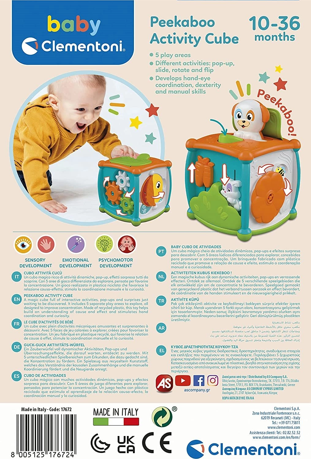 Kleurrijke en dynamische Clementoni-kubus uit de Baby-lijn, vol leuke activiteiten en verrassende effecten. Ideaal voor de ontwikkeling van tastzin en motorische vaardigheden dankzij de uitschuivende diertjes en het gemakkelijke vastpakken.