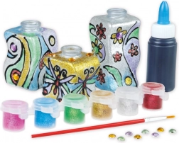Ontdek creatief plezier met de set voor schilderen op glas. De set bevat alles wat je nodig hebt om originele decoraties te maken – 3 vazen, 6 sprankelende kleuren, een penseel, decoratieve steentjes en boetseerklei. Stimuleert creativiteit, fijne motoriek en de fantasie van kinderen.