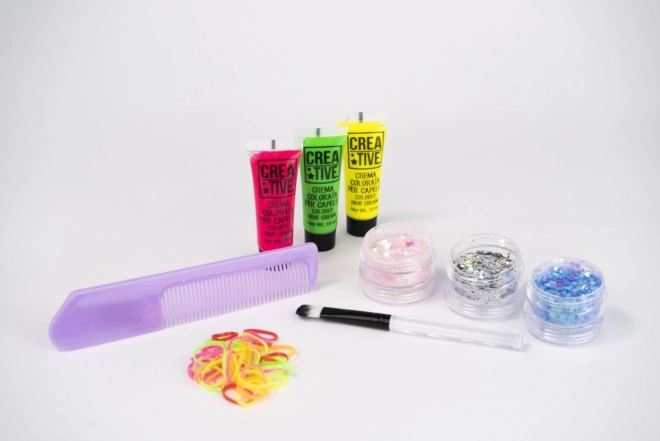 Breng kapsels tot leven met de creatieve set voor kleine styliste! Bevat 3 kleurengels, 3 glitterstrooisels, elastiekjes, een kwastje en een kam voor eenvoudig aanbrengen en het creëren van originele looks.