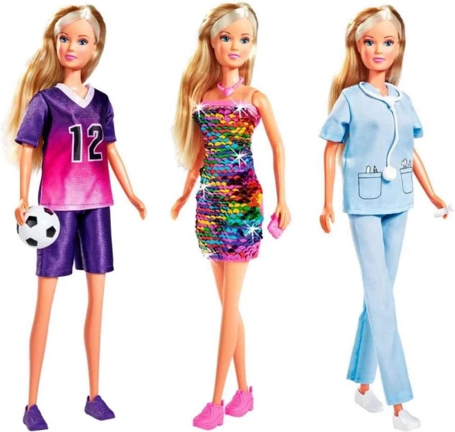 Pop Steffi met 3 verschillende outfits: een paillettenjurk SWAP, een doktersoutfit en een voetbaloutfit. Wordt geleverd met accessoires.