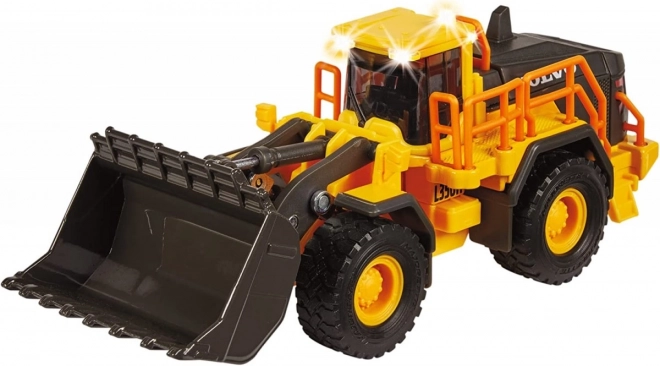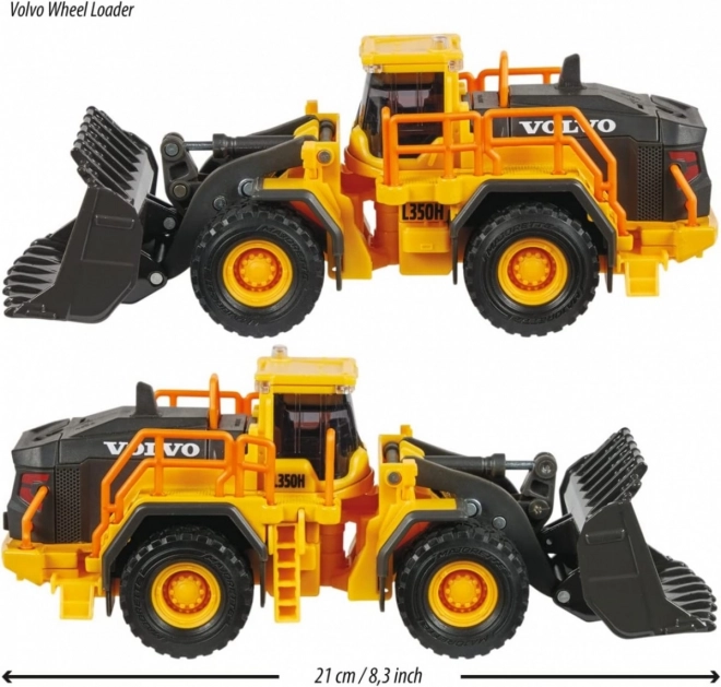Gelicentieerde VOLVO wiellader zonder motor met licht- en geluidsfunctie. De cabine is gemaakt van metaal. Zachte rubberen banden kunnen moeiteloos over het ruwe terrein op de bouwplaats rijden. Beweegbare onderdelen: te openen achterdeuren, bak en cabine; dankzij de besturing kan het voertuig gemakkelijk naar rechts en links sturen. Lengte: 21 cm.