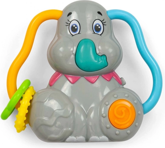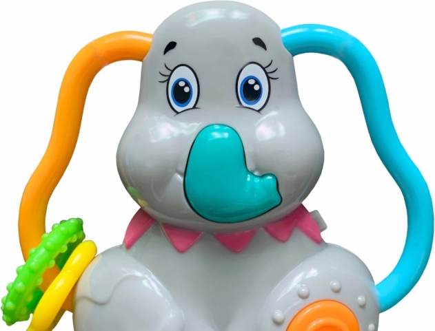 Interactief ontwerp: De olifantvormige rammelaar is uitgerust met gevormde oortjes voor een gemakkelijke grip en om kleurrijke ringen te verschuiven. Bij het indrukken van de slurf klinkt een olifantengeluid en de zes melodieën kunnen worden gewisseld met het oranje wieltje.