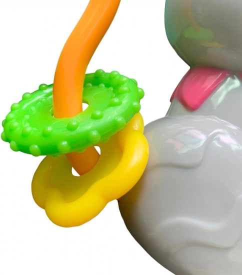 Het rammelaar heeft oortjes voor een gemakkelijke grip en maakt het mogelijk om kleurrijke ringen met reliëf te verschuiven.