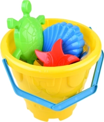 De kunststof emmer met blauwe handgreep en vormpjes binnenin maakt het eenvoudig mee te nemen naar het strand of de tuin.