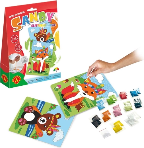De zandteken-set met vos- en beermotieven zal jonge kunstenaars aanspreken die graag sprankelende afbeeldingen maken. Kinderen maken stap voor stap delen van de zelfklevende sjablonen vrij en strooien er gekleurd zand of glitter overheen. Het resultaat zijn unieke, glinsterende illustraties zonder lijm of schaar.