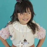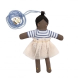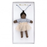 De ketting is gemaakt van een uitstekend gemaakte pop genaamd Ruby en een blauwe kralenketting. De pop Ruby is van katoen en heeft een mooie rok van perzikkleurige tule.