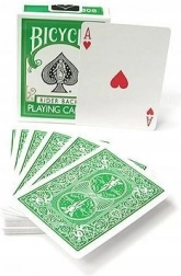 De groene editie van de iconische BICYCLE-speelkaarten in pokergrootte biedt topkwaliteit voor zowel goochelaars als spelers. Dankzij de Air‑Cushion Finish laten de kaarten zich gemakkelijk schudden, glijden ze soepel en gaan ze langer mee. De groene achterkant en het groene doosje zijn ideaal voor kleurveranderingen en regulier spel; het deck bevat bovendien 1 joker en 3 gaff-kaarten.