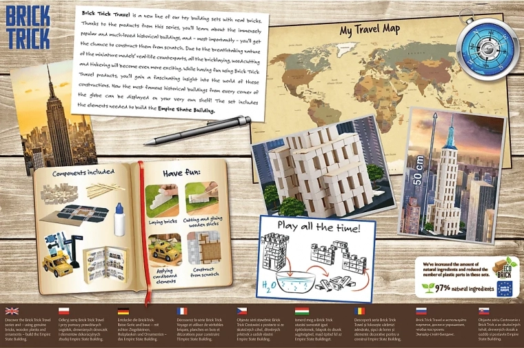 Bouw de EMPIRE STATE BUILDING met TREFL BRICK TRICK Travel XL. Meer dan 420 steentjes, houten onderdelen, decoraties en in water oplosbare lijm voor herhaald bouwen.